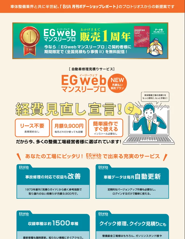 格安!自動車修理見積もりサービス 『EGwebマンスリープロ』1周年企画 『EGwebプロ』月額契約者に、 期間限定で『全国見積り事情II』を無料配信! また、指数テーブル・車種別編も掲載を予定! BSR(ボデーショップレポート)