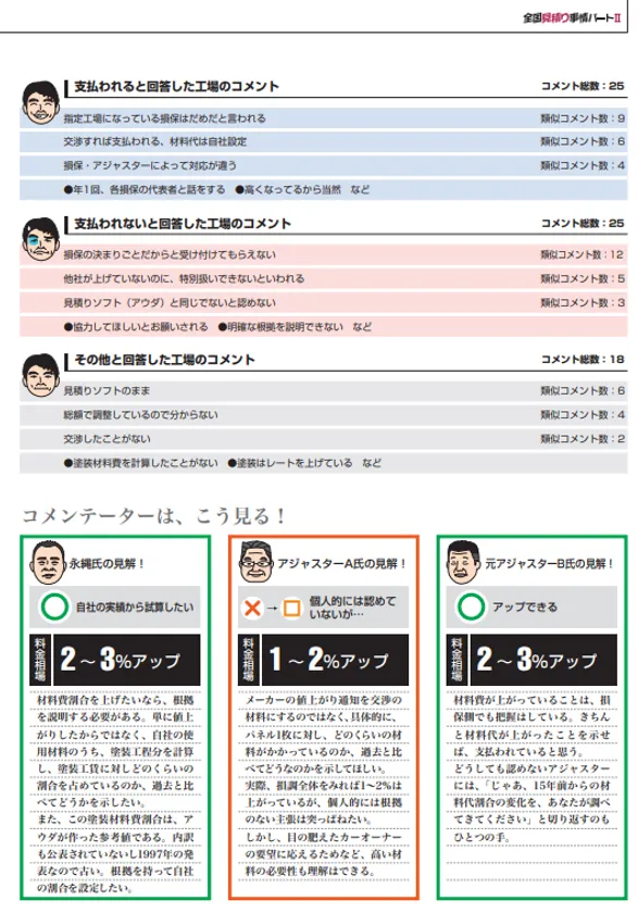 『全国見積り事情II』はMOOK本として刊行されたため、今では入手困難な書籍です。しかし、現在も編集部に問い合わせが続いており、自動車車体整備業界での修理見積もり業務には、今なお有益なデータが掲載されています。