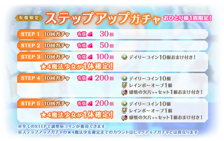 ※STEP3、STEP5での★4魔法少女について、ピックアップ対象の魔法少女が確定するわけではございません。