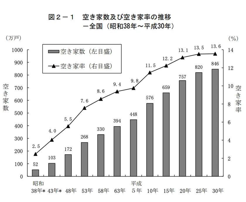 総務省「住宅・土地統計調査」によれば、全国の空き家数は、過去30年(1988年~2018年)で394万戸から846万戸となり、100%(2倍)以上増加してきています。空き家率(空き家戸数が総住宅戸数に占める割合)も上昇を続けており、2018年の空き家率は13.6%に達しました。野村総合研究所が2015年に発表したデータによると、2033年には全国で3軒に1軒が空き家になるという予測がでています。