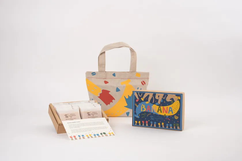 パッケージは、バナナワッフルクッキーの誕生を祝して踊るサル達がモチーフ。見ているこちらまで楽しくなるような賑やかな限定デザインになっています。