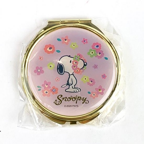 スヌーピーのお顔に花冠がかけられたデザインのコンパクトミラーです。淡いパープルの色合いとお花がマッチした、乙女心トキメクアイテム!お化粧直しの際にこのミラーをパカっと開けば、上手にお化粧が出来そうですね♡