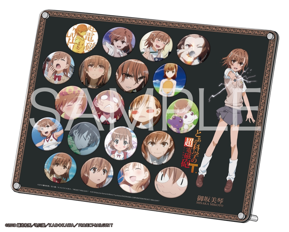 また、缶バッジの新しい楽しみ方として部屋に飾れる缶バッジセットも登場。御坂美琴と『とある科学の超電磁砲T』で注目を集めた「食蜂操祈」の作中のシーンから厳選した20種類の缶バッジを高級感のある特製のアクリルボードに収納。缶バッジは取り外し可能なので、普段使いとしてもお楽しみいただけます。