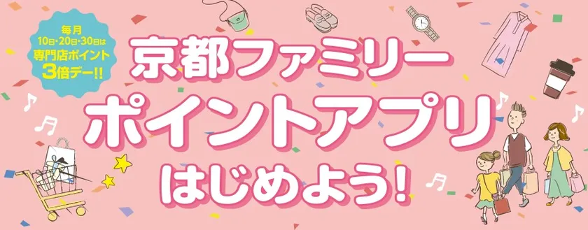 6月24日から6月26日の期間中に、京都ファミリーアプリ会員限定で、2,000ポイントが抽選で320名様に当たる、買えば買うほどチャンスが増える64万ポイント山分けキャンペーンを行います。京都ファミリー専門店アプリ対象45店舗で、1回3,000円(税込)以上のお会計(ポイント付与)を1口として抽選に自動応募されます。