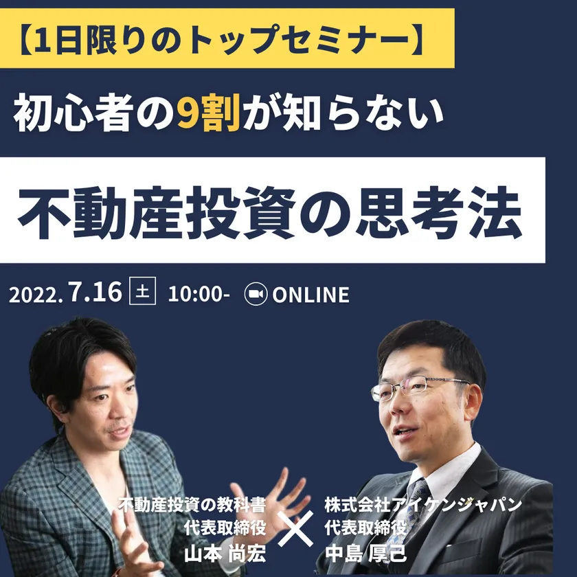 不動産投資の教科書×アイケンジャパン トップ同士の共催セミナーを7月16日(土)に開催 ~初心者の9割が知らない不動産投資の思考法~