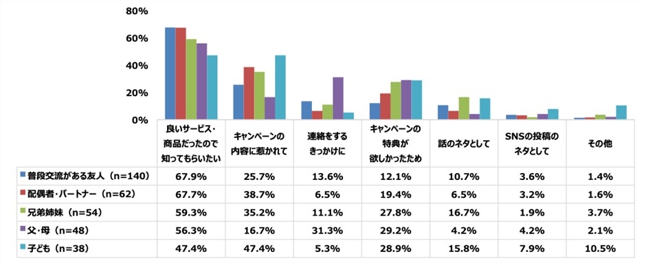紹介キャンペーンに参加した理由について、紹介した相手に関係なく「良い商品・サービスだったので知ってもらいたい」という回答が最多に。キャンペーンの特典欲しさだけで参加しているというよりは、純粋に自分が良いと感じた商品・サービスを誰かに紹介したいと考える人が多いようです。