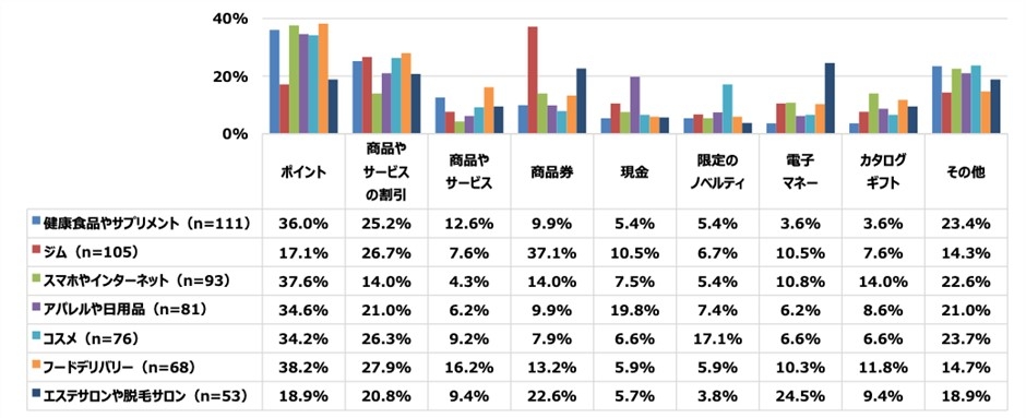 ・キャンペーン特典の内容は、「ジムの入会」や「エステサロンや脱毛サロンの契約」に関しては「商品券」や「電子マネー」、その他の商品・サービスは「ポイント」や「割引」が多い傾向にあった。