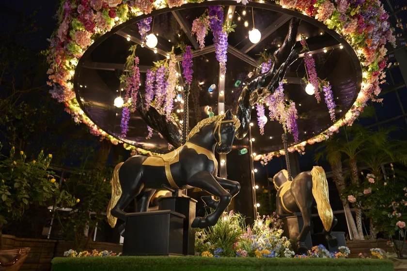 メリーゴーランド「ブリリアント ツリー」は夜間ライトアップの際の色彩を際立たせるために回転木馬としては珍しい「黒馬」と「黒い支柱」を持つ、漆黒のメリーゴーランドです。同木馬にはバラ科のフルーツであるリンゴのランプやガラス作家が製作した宝石などが散りばめられています。乗車の際にはシャボン玉が飛び出すバブルガンを片手に乗車し、色彩とシャボン玉に包まれた乗馬が楽しめます。