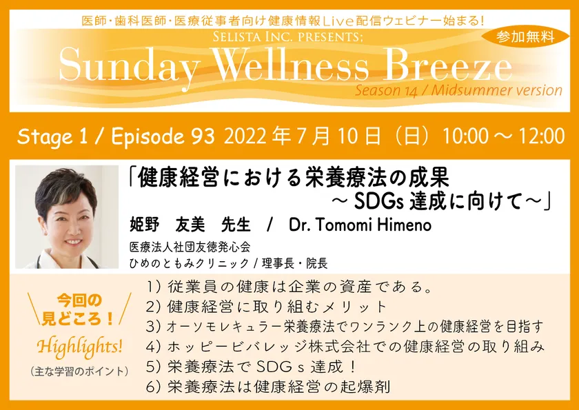 《医師・歯科医師・薬剤師・医療従事者限定無料セミナー》 『健康経営における栄養療法の成果~SDGs達成に向けて~』 講師に姫野 友美先生を迎え7月10日(日)オンラインで開催