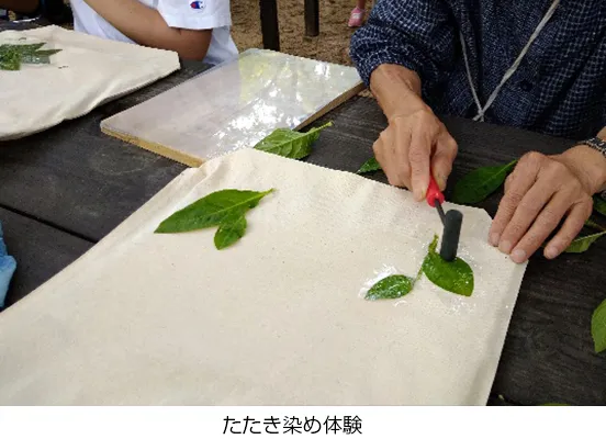 藍の葉っぱをたたいてエコバッグに模様をつけるワークショップです。