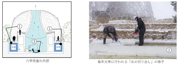 展望台内部の「1. 氷室(ひむろ)」には冬に「2. 氷棚(ひょうだな)」に張った天然の氷を切り出して貯蔵しています。夏に氷室を開いて風を取り込むと、氷室を通った冷たい風が展望台内部へ送られます。展望台の内部は天然のクーラーで冷やされ真夏でも20℃程度に保たれます。