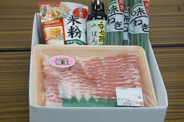 「ねぎを味わう~モチっと米粉でねぎ焼きセット」は大分県ブランド小ねぎの味一ねぎとSPF豚桜王、Aコープ米粉、かぼすポン酢がセットになっています。