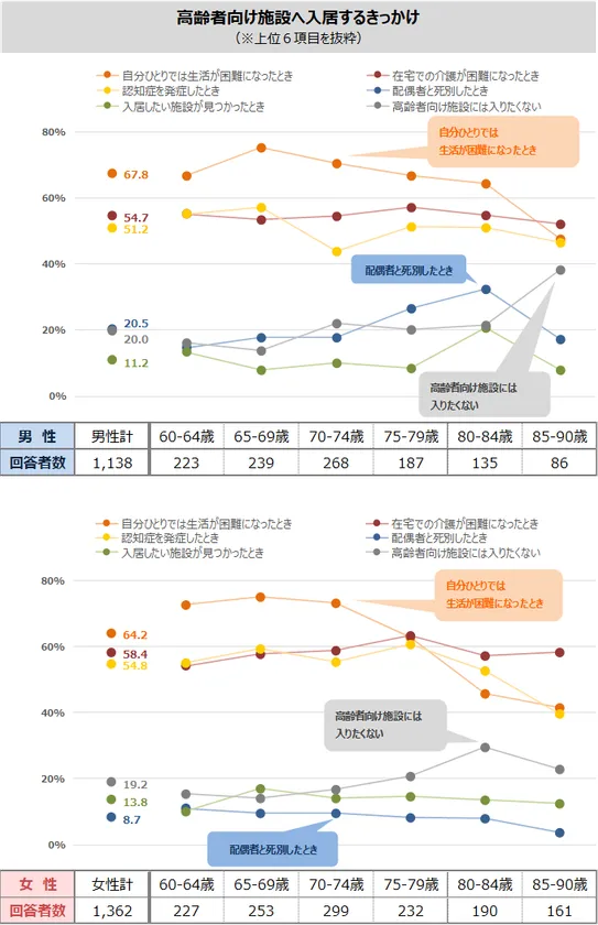 高齢者向け施設への入居きっかけ・タイミングについて、60~90歳男女の6割半が「自分ひとりでは生活が困難になったとき」を挙げた。男女ともに60代後半で7割を超えて最も高くなる。