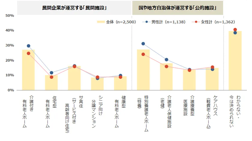 現時点での入居を考えている・希望している高齢者向け施設の種類を確認したところ、約4割は「わからない・今は決められない」と回答した。民間施設で最も高いのは「介護付き有料老人ホーム」で27.0%、公的施設で最も高いのは「特別養護老人ホーム(特養)」27.2%という結果だった。