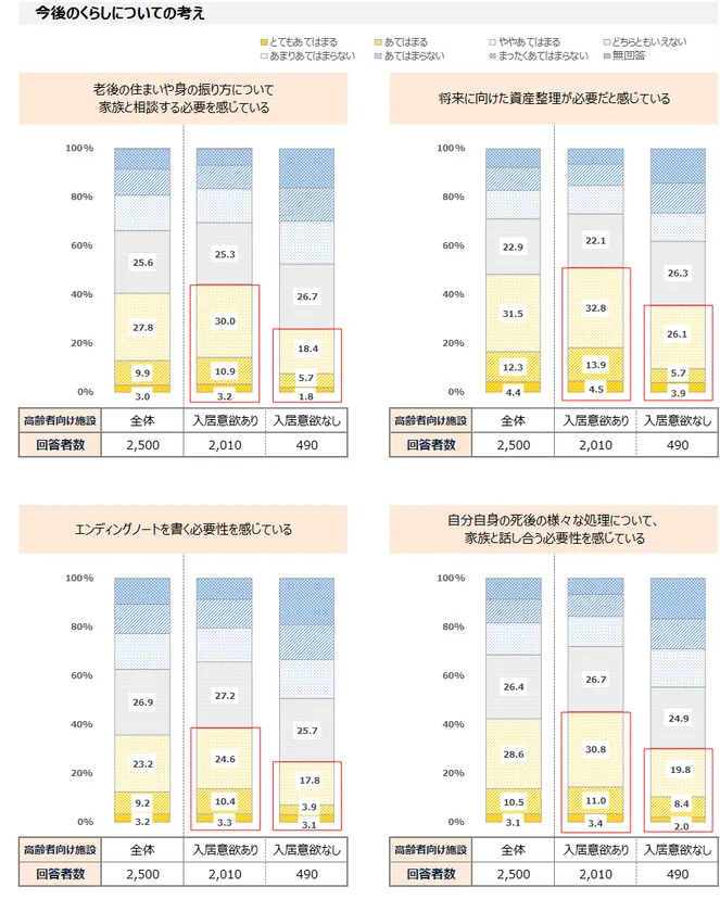 高齢者向け施設への入居意欲がある人とない人とでは、入居意欲のある人のほうが、今後のくらしについて検討する必要性を高く感じていた。「老後の住まいや身の振り方について家族と相談する必要を感じている」「将来に向けた資産整理が必要だと感じている」「エンディングノートを書く必要性を感じている」「自分自身の死後の様々な処理について家族と話し合う必要性を感じている」いずれの考えでも高齢者向け施設への入居意欲がない人と比べて、入居意欲がある人は10ポイント以上高い。