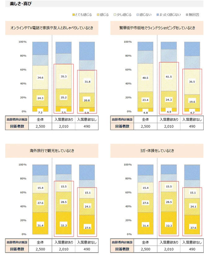 高齢者向け施設へ入居意欲がある人は、「楽しさ・喜び」を感じる傾向が強い