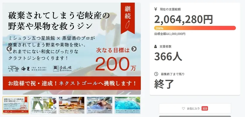 「CAMPFIRE」壱岐島初!クラフトジンを造りたい!~島のフードロス問題を解決~