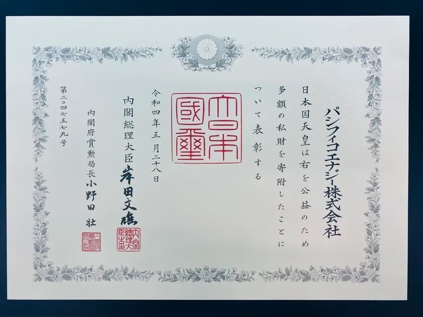 パシフィコ・エナジー株式会社(本社:東京都港区、代表取締役社長:松尾 大樹、以下「パシフィコ・エナジー」)は、岡山県のまち・ひと・しごと創生寄附活用事業に対する支援に対し、その功績が認められ、「紺綬褒章」を受賞したことをお知らせいたします。本日、パシフィコ・エナジーにて伝達式が執り行われ、岡山県東京事務所 玉置 明日夫 所長より褒状が授与されました。