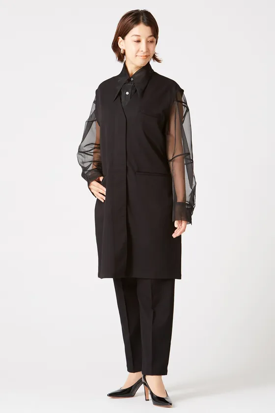 コスメと聞くと、これまではふわふわキラキラしたイメージがありましたが、今はジェンダーにとらわれずそれぞれが個性を表現する時代。型にハマらずに自分の個性でいかようにも表現できるように、着こなし次第でシルエットに変化がつけられる1着になるよう仕上げました。