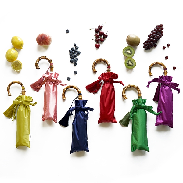 果実をモチーフにしたサテンフルーツパラソルは、高級感のあるサテン生地を使って果実のみずみずしさや艶やかさを表現。生地の裏面には黒のコーティングを施しており、紫外線遮蔽率99%、遮光率99.99%、遮熱効果ありのハイスペックな生地を使用しています。晴れの日も雨の日も活躍する晴雨兼用傘です。
