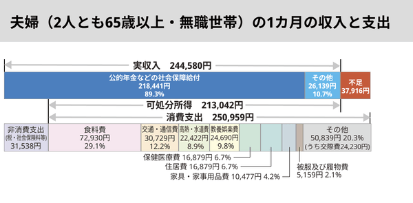 定年後の主な収入源は公的年金です。総務省の家計調査年報によると、夫婦ともに65歳以上の無職世帯(夫婦のみ)の可処分所得は約21万3,000円で、消費支出は約25万1,000円です。毎月約3万8,000円不足している現状がわかります。