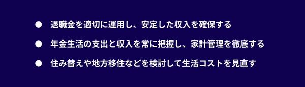 定年退職してからも、人生はまだまだ長く続きます。退職金を上手に運用して収入源を確保し、年金生活の家計管理を徹底して、必要に応じて住み替えや地方移住で生活コストを最適化するなど、総合的な工夫をすることで、老後への不安を減らして充実したセカンドライフを送れます。