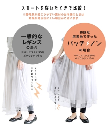 パッチノン裏起毛レギンスは、特殊な炭素糸を使用しており、静電気によるパチパチ感やスカートなどのボトムスが脚にまとわりつく煩わしさを軽減します。
