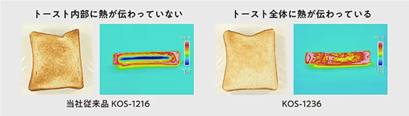 ※当社従来品KOS-1216(消費電力:1200W、温度調節:約80~230℃、トースト枚数1~4枚)とKOS-1236の比較