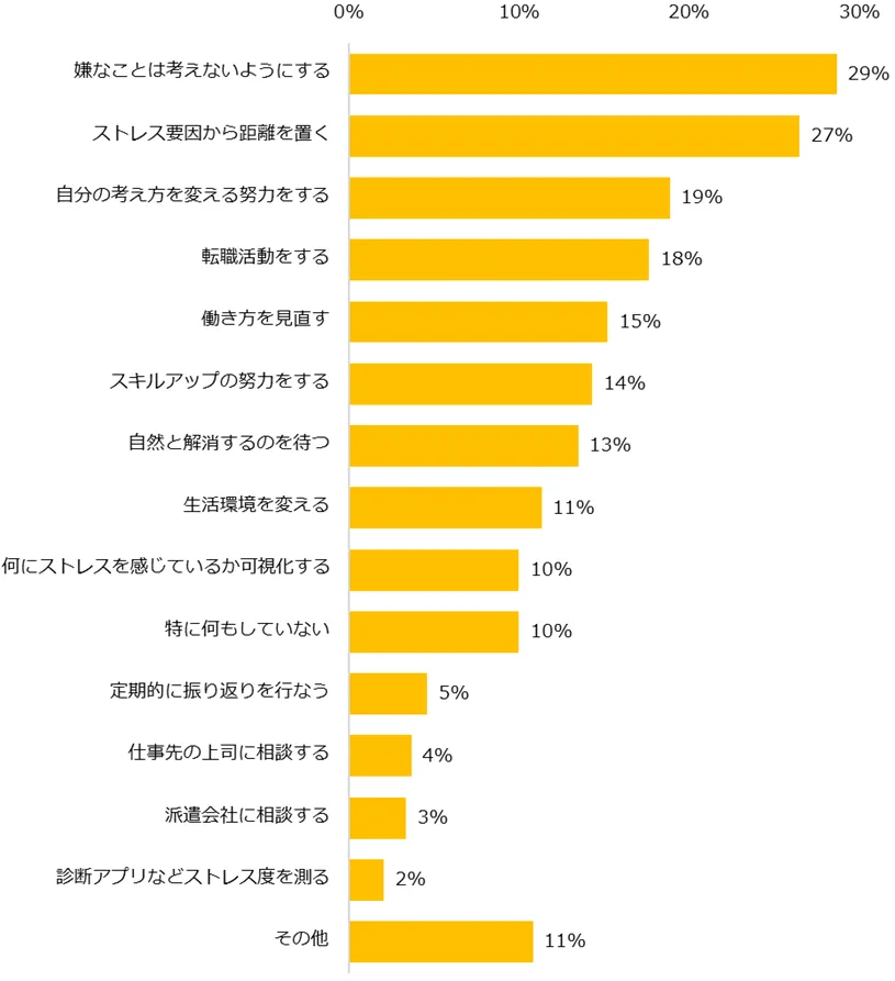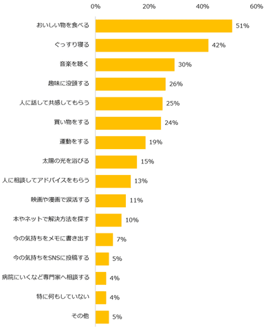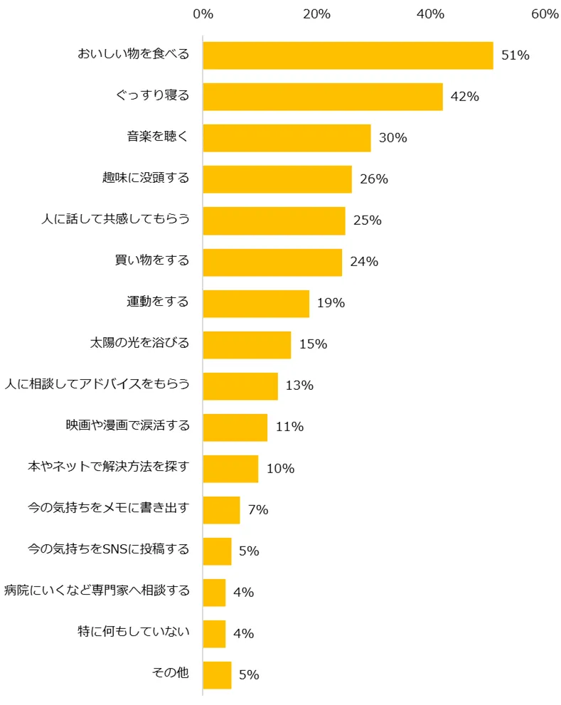 「ストレス要因を減らすために、どんな事をしていますか?」と伺ったところ、第1位は「嫌なことは考えないようにする」(29%)でした。あわせて「ストレス解消のために、どんな事をしていますか?」と伺うと、上位は「おいしい物を食べる」(51%)、「ぐっすり寝る」(42%)でした。具体的なコメントもあわせて紹介します。