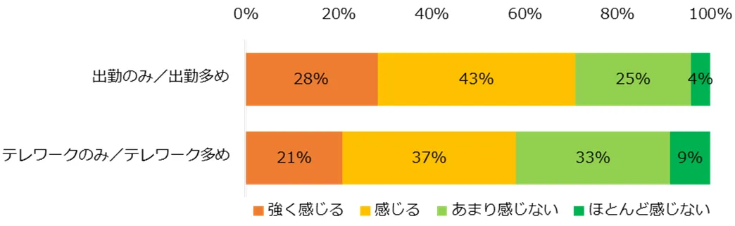 勤務スタイル別にみると、出勤のみ/出勤多めの人は71%がストレスを感じると回答。テレワークのみ/テレワーク多めの人の58%より13ポイント高い結果となりました。テレワークより出勤のほうがストレスを感じることが伺えます。勤務スタイル別の具体的なコメントもあわせて紹介します。