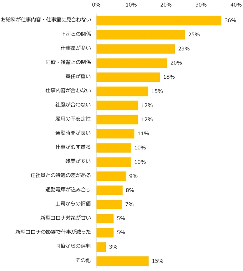 「仕事上でストレスを感じる時、特にどのような点で感じますか?」と伺ったところ、第1位は「お給料が仕事内容・仕事量に見合わない」(36%)でした。次いで「上司との関係」(25%)、「仕事量が多い」(23%)が続きました。勤務スタイル別でみても、第1位は同様の結果でした。仕事で感じるストレスは、勤務スタイルが異なっても大きく変わらないようです。具体的なコメントもあわせて紹介します。