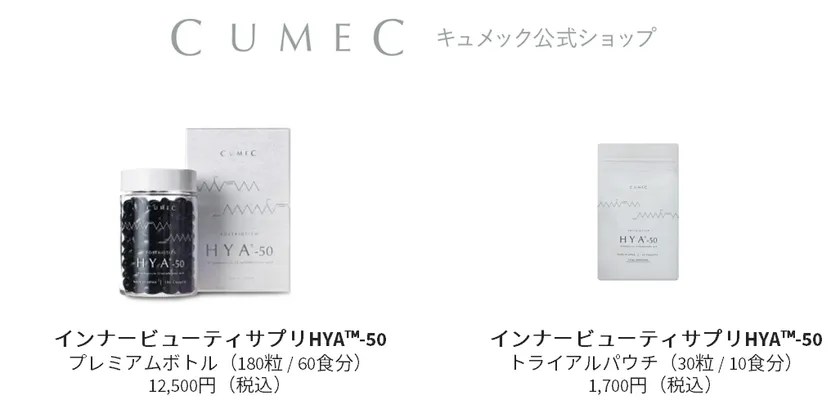 キュメック公式ショップ楽天市場店では、公式オンラインショップで人気の「インナービューティサプリHYA(TM)-50」シリーズのうち、トライアルパウチ(30粒)とプレミアムボトル(180粒)を販売しております。