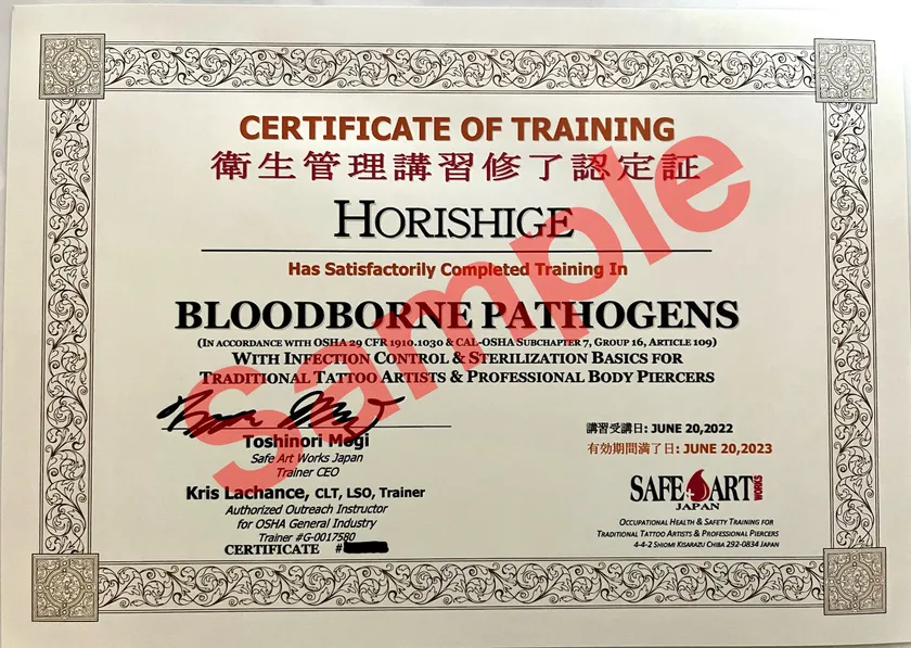 アメリカはタトゥー施術者の衛生講習受講が必須条件となっており、ミシガン州ランシングでは「タトゥー・ピアッシング施術者向け衛生管理講習トレーナー」の資格取得プログラムがあります。茂木は、正しい知識の習得とその知識の普及活動を行うため、2018年に渡米し、その資格を取得します。日本に帰国後、対面による衛生管理講習を行ってまいりました。