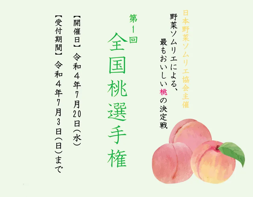一般社団法人日本野菜ソムリエ協会(所在地:東京都中央区、理事長:福井 栄治、以下 当協会)は、「日本の農業を次世代に継承し、食を日常的に楽しめる社会の創造」という理念のもと、誰しもが健康的で幸福な生活を求めることのできる社会の実現を目指しています。当協会は“野菜・果物のプロ”である野菜ソムリエが最もおいしい桃を選ぶ「第1回 全国桃選手権」を2022年7月20日(水)に開催いたします。