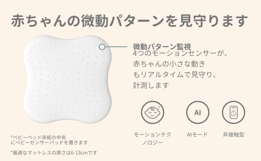 AI人工知能技術で赤ちゃんの睡眠を見守る 『CuboAiスマートベビーモニター』と連携し、 赤ちゃんの細かな動きを検知してさらに手厚く赤ちゃんを 見守る追加アイテム『CuboAiベビーセンサーパッド』が登場 2022年6月28日販売開始
