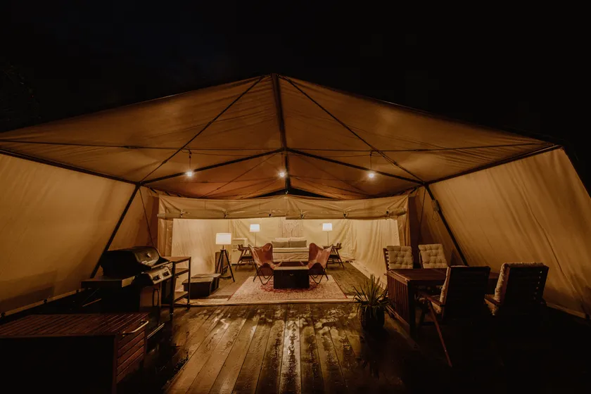 外部テントも内装もラグジュアリーな演出と充実した設えと設備になってワンランク上の上質なキャンプが楽しめます。