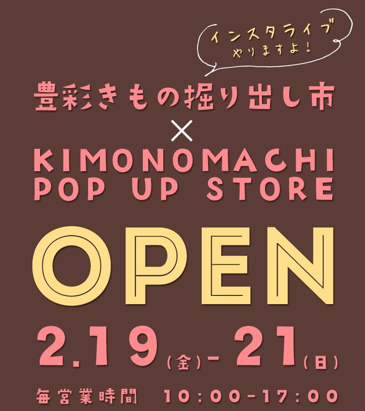 京都発の和装ブランドKIMONOMACHI(京都きもの町、本社:京都府京都市、本社:豊彩株式会社)は2/19(金)~2/21(日)、京都五条にある豊彩ビル1F 催し会場にて、定期開催のポップアップストアを開催する。同ブランドはファッション誌や映画・ドラマにも衣装提供実績豊富で、毎年お洒落なオリジナルキモノを発表していることでも注目されている。ポップアップストアと同時に、着物総合プロデュース企業「豊彩」ならではのリサイクル着物を取り揃えた着物フリマも開催する。