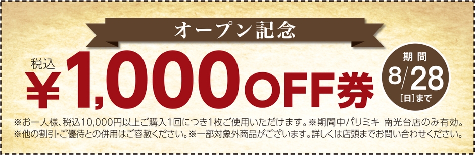 税込10,000円以上お買い上げで、1,000円(税込)を割引いたします! 下記の画像を印刷してお持ちいただくか、画面のスクリーンショットをスタッフにご提示ください。※パリミキ 南光台店のみ有効。