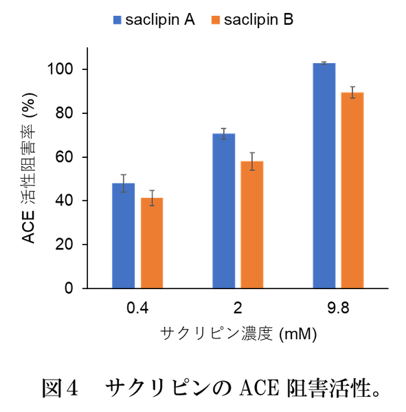 血圧上昇に関わる成分アンジオテンシンIIは、アンジオテンシン変換酵素(ACE)注8)のはたらきによって生成します。ACE阻害は高血圧治療に利用される作用機序の一つです。本研究でサクリピンのACE阻害作用を調べたところ、サクリピンA, BともにACE活性を阻害することが分かりました(図4)。この結果は、サクリピンが血圧上昇抑制作用を有することを示しています。サクリピンBよりもサクリピンAが強い活性を示しました。食品として流通している乾燥スイゼンジノリにはサクリピンAが相対的に多く含まれているため、スイゼンジノリを摂取することが血圧の改善につながる可能性があります。
