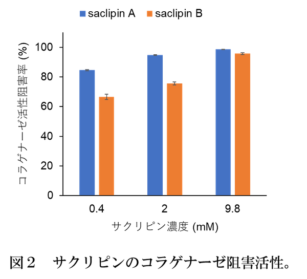 コラゲナーゼは蛋白質分解酵素の一つで、皮膚の真皮層に存在して肌の弾力を保つ繊維状蛋白質コラーゲンを分解します。コラーゲン繊維の減少により肌の弾力が低下し、しわやたるみの原因になることが知られています。本研究でサクリピンのコラゲナーゼ阻害作用を調べたところ、サクリピンA, Bともにコラゲナーゼ活性を阻害することが分かりました(図2)。この結果は、サクリピンが肌の弾力を保ち、老化を抑制する作用を有することを示しています。サクリピンBよりもサクリピンAが強い活性を示しました。