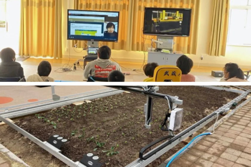 2020年度〜2021年度では、姫路市立書写養護学校に設置されたファームボット(※3)を利用し、同校中学部の生徒に遠隔操作による野菜の栽培などの学習を提供することで、農福連携や農業分野でのSTEAM教育の実証を進めました。プロキッズは教材を提供するとともに授業を行い、生徒が教室のパソコンから中庭に設置してあるファームボットを操作して定期的な水やりを自動化するなど、ICT導入による農業を体験してもらいました。