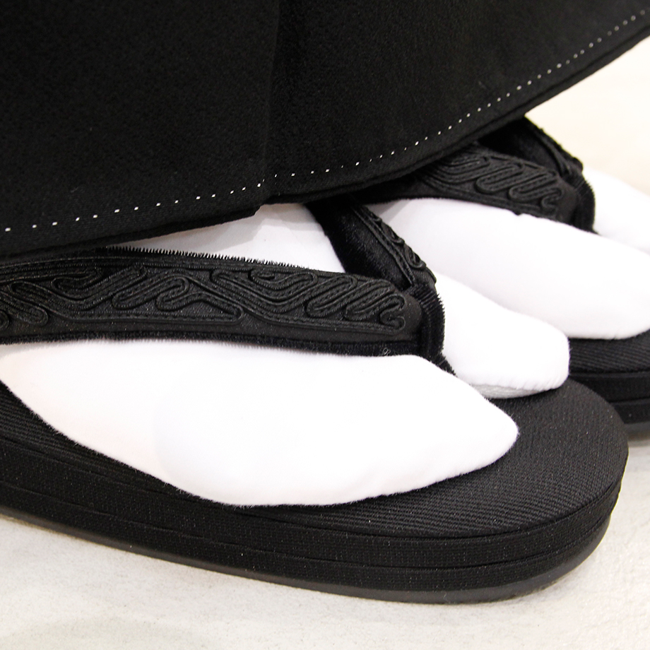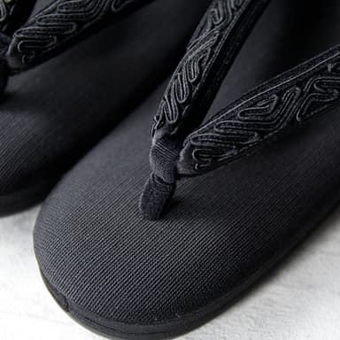 履き心地を徹底追及した2種のクッションスポンジを採用しました。底は黒にこだわった「滑りにくいラバー底」を使用。殺生のイメージにつながる革素材を避け米沢織で作りました。鼻緒部分にはオリジナル柄のコード刺繍を施しました。
