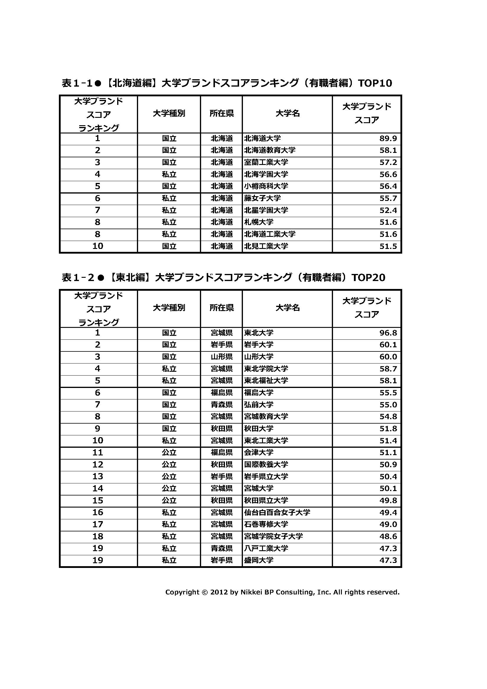 全国の主要大学計468校の「大学ブランド力」算出を目的としたインターネット調査(医科大学や体育大学、短期大学などは除外)。「地域産業への貢献度」や「研究施設の充実度」、また学生の「語学力」や、「コミュニケーション能力の高さ」など大学や在学生へのブランド・イメージ49項目を測定し、それらをまとめた大学ブランドスコア(=大学ブランド力指数。偏差値)を算出してランキング化した。調査にあたって、日経BP/日経BPコンサルティング調査モニターを中心に、同地域にお住まいのお仕事をお持ちの方(有職者)や、中学生以上の子供がいる父母、教育関連従事者に回答を依頼。なお、調査設計や分析にあたり、企業ブランドおよび製品/サービスブランドの調査で実績のある「ブランド・ジャパン」で培ったノウハウを活用し、調査するイメージ項目を洗い出した。北海道・東北編は2012年8月1日~31日に実施し、北海道は1,524件、東北は2,720件(同地域在住の有職者、学生の父母)の有効回答を得た。2012年11月21日に地域ごとの調査結果報告書を発行。