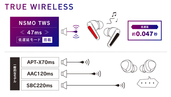 NSMO TWSは47msという低遅延をaptX LLなどの限定コーデックを使わず、SBCやAACで実現しました。aptX-LLをサポートしていないデバイスでも同等の低遅延を体験できます。iPhoneやiPadユーザーでも通常のAAC接続に比べると約2.5倍もの低遅延を実現。