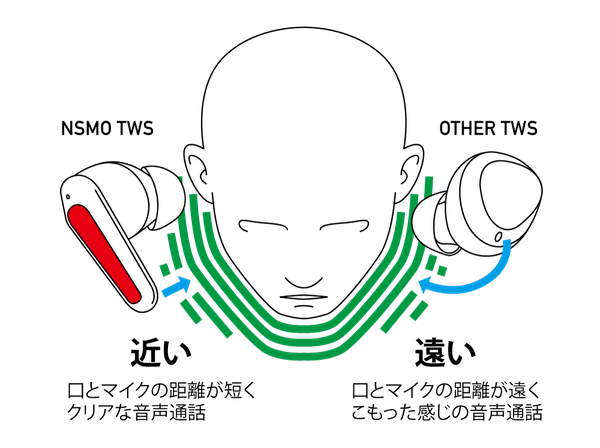 NSMO TWSのマイクは、口の方向(音源)を向くように内側に設計されています。マイクは非常に低い周波数と非常に高い周波数のサウンドを排除し、スムーズでクリアな音声を実現しました。話し手と聞き手の両方の声がはっきりと聞こえ、ゲーミング時のボイスチャットはもちろん、電話会議やテレビ会議にも威力を発揮します。