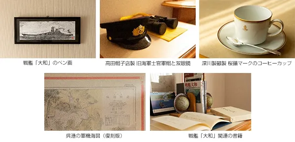 呉阪急ホテル(広島県呉市中央1丁目1番1号 総支配人:松浦 修司)ではこの春、呉市海事歴史科学館「大和ミュージアム」のパートナーホテルに認定されたことに伴い、6月18日(土)より旧海軍をイメージしたコンセプトルーム「大和(やまと)」を新設し、宿泊プランの販売を開始いたしました。室内には戦艦「大和」のペン画を飾り、旧海軍士官軍帽(レプリカ)や、当時をイメージした双眼鏡を展示。戦艦「大和」で愛飲されていたコーヒーを再現した昴(すばる)珈琲店の「海軍さんの珈琲」をご用意し、備え付けの桜錨マーク入りのコーヒーカップでお召し上がりいただけます。戦艦「大和」関連の書籍、呉港の軍機海図(復刻版)などをご覧いただきながら、呉での滞在をお楽しみください。