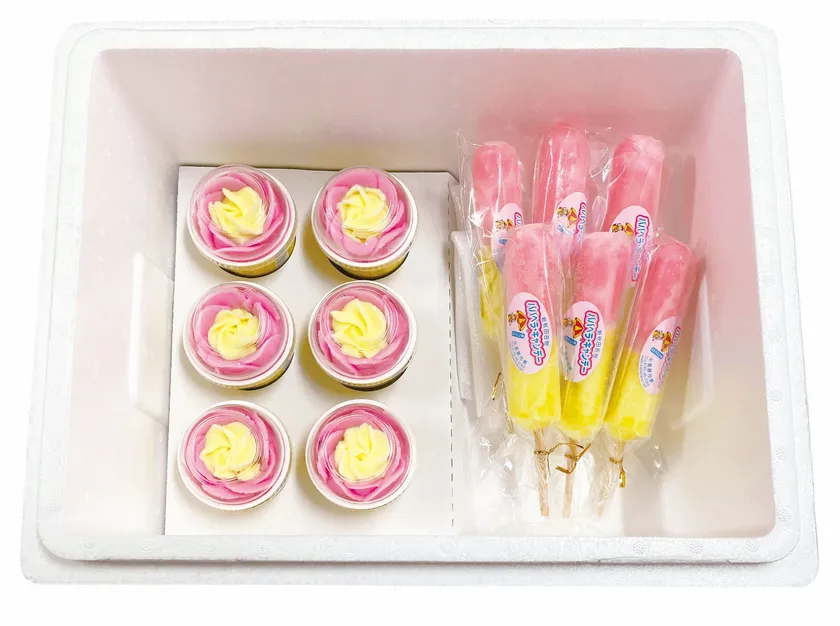 秋田の夏の風物詩「ババヘラ・アイス」。ひとつひとつ手作りされた、バラ盛りと呼ばれるバラの花のように美しく盛り付けられたカップアイスと手軽に食べられる棒付きのキャンデータイプのセットです。