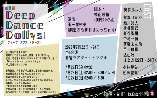 企画・制作:ks.EnterTAIN企画による朗読劇『Deep Dance Dollys!』が2022年7月22日(金)~7月24日(日)に新宿シアター・ミラクル(東京都新宿区)にて上演されます。