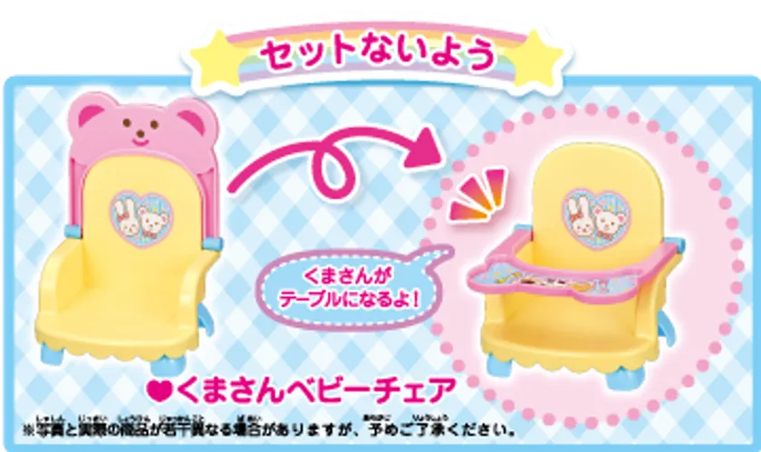 新発売の、「くまさんベビーチェア」は、メルちゃんやおともだちにぴったりなサイズのベビーチェアで、くまさんを前に倒すとテーブルになります。別売りパーツの「まほうのベビーマグ」や「メルちゃんのキッズプレート」と合わせて、ぜひ一緒に遊んでくださいね。