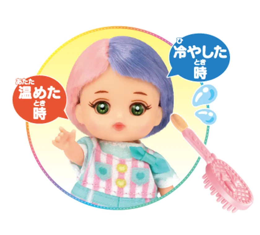 従来のメルちゃんシリーズ同様に、パイロットコーポレーション独自のメタモヘアを使用しており、氷水(15℃以下)で髪の毛の色が変化します。髪の毛全体の色を変えたり、一部だけ模様をつけたりオリジナルのヘアアレンジが楽しめます。部屋の中やお風呂ではもちろん、小さいのでポケットやバッグに入れて、お外に連れて行って一緒に遊ぶことも出来ます。